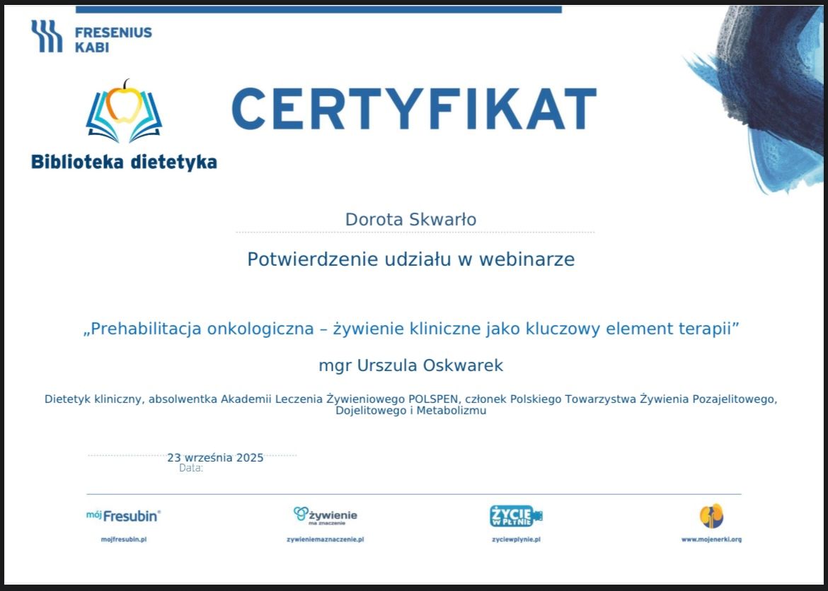 Ukończyłam dietetykę na Gdańskim Uniwersytecie Medycznym oraz psychologię na Uniwersytecie SWPS. Ukończyłam również studia podyplomowe z dietetyki klinicznej w Collegium Medicum Uniwersytetu Jagiellońskiego, a także żywienia w sporcie na Akademii Wychowania Fizycznego i Sportu w Gdańsku, oraz Akademię Leczenia Żywieniowego POLSPEN. Jestem członkiem Polskiego Towarzystwa Medycyny Stylu Życia i Polskiego Towarzystwa Lipidologicznego, Polskiego Towarzystwa Żywienia Pozajelitowego, Dojelitowego i Metabolizmu, oraz Polskiego Towarzystwa Żywienia Klinicznego. Nieustannie pogłębiam swoją wiedzę biorąc udział w licznych szkoleniach i konferencjach. Na co dzień pracuję jako dietetyk kliniczny w Uniwersyteckim Centrum Klinicznym w Gdańsku. Jestem również wykładowcą akademickim na Uniwersytecie WSB Merito.